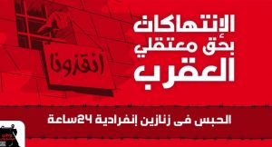 وقد تداول النشطاء، اليوم الأحد، فيديوجراف لجملة الانتهاكات بحق المعتقلين في العقرب، ومنها على سبيل المثال: “الحبس فى زنازين انفرداية طوال 24 ساعة، النوم على خرسانة دون بطانيات وبلا غطاء، وتجريدهم من الطعام والغطاء وتقديم الأطعمة في أكياس بلاستيك، فضلاً عن حفلات التعذيب التي لا تتوقف”.