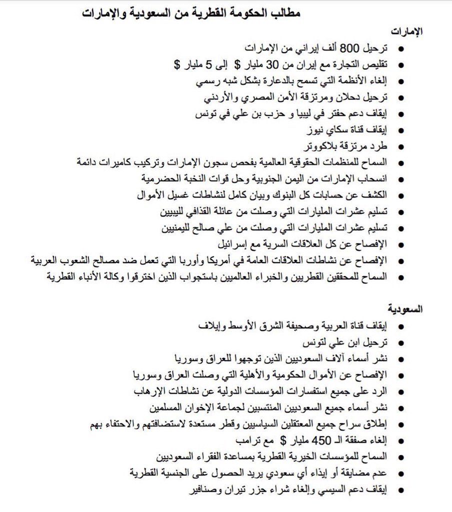 قائمة مطالب من قطر للامارات والسعودية منتشرة على وسائل الاجتماعي 23 يونيو، 2017 قائمة مطالب من قطر للامارات والسعودية منتشرة على وسائل الاجتماعي 2017-06-23 fr tweet