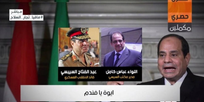 لكن في المقابل أظهرت التسريبات خطابا مختلفا تماما يشير إلى أن قادة الجيش ينظرون إلى الدولة ومواردها كنوع من الغنيمة أو طريقا لتحقيق الطموحات الشخصية، ففي فبراير 2015 بثت قناة “مكملين” تسريبا من داخل مكتب السيسي بوزارة الدفاع، قال فيه الأخير للواء عباس كامل عبارة لافتة وهي “حلال علينا البلد”.