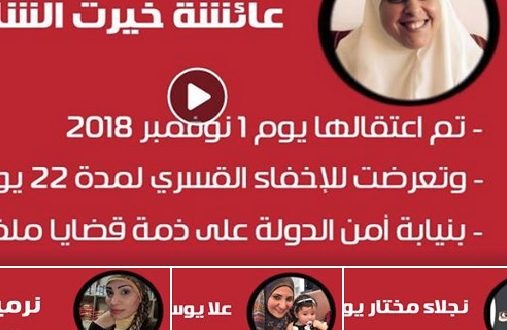 * عائشة خيرت الشاطر، التي تم اعتقالها يوم 1 نوفمبر 2018، وتعرضت للاخفاء القسرى لمدة 22 يوما؛ حيث ظهرت بعدها في نيابة أمن الدولية، ولفقت لها اتهامات لا صلة لها بها.