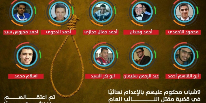 في ظل تصاعد حالة السعار التي أصابت نظام الانقلاب منذ بداية السنة الجديدة “2019”م، تحذر دوائر حقوقية من قيام نظام العسكر بتنفيذ حكم الإعدام بحق “9” من الضحايا في هزلية مقتل النائب العام السابق هشام بركات في صيف 2015م؛ حيث تم اختطاف الشباب المحكوم عليهم بالإعدام ظلما وتعذيبهم وإجبارهم على الاعتراف بالجريمة التي لم يفعلوها ورغم أنهم نفوا علاقتهم بالجريمة أمام النيابة والقضاء، والتأكيد أنهم تعرضوا لأبشع صور التعذيب والانتهاكات لإجبارهم على الاعتراف إلا أن المحكمة أخذت بتحريات الأمن وأصدرت حكمها الذي افتقد إلى أدني معايير العدالة والنزاهة.وكانت محكمة النقض قد أيدت في سبتمبر 2018 حكم الإعدام الصادر بحق هؤلاء الضحايا، ومن أبرز من صدر بحقهم حكم الإعدام النهائي، أحمد نجل محمد طه وهدان عضو مكتب الإرشاد بجماعة الإخوان (أعلى هيئة تنفيذية بالجماعة). ومحمود الأحمدي وأحمد جمال حجازي وأحمد الدجوي وأحمد محروس سيد وأبو القاسم أحمد وعبدالرحمن سليمان وأبو بكر السيد وإسلام محمد.هذه التحذيرات الحقوقية تأتي في أعقاب التفجير الانتحاري الذي نفذه مجهول مساء أمس الإثنين 18 فبراير 2018م بمنطقة الأزهر وأدت إلى مقتل ثلاثة من عناصر الشرطة وإصابة “6” آخرين بينهم 3 من عناصر الشرطة وطالب أزهري تايلاندي الجنسية، وسط مخاوف من توظيف سلطات الانقلاب هذه الحادثة سياسيا على مسارين:الأول هو ما تخشاه دوائر حقوقية بارتكان النظام جريمة جديدة بتنفيذ الإعدام في هؤلاء الضحايا التسعة بهزلية النائب العامرغم أنهم لا علاقة لهم بهذه الحوادث وذلك ثأرا لعناصرها المقتولة في الحادث الانتحاري الذي نفذه بحسب وسائل الإعلام الموالية للنظام شاب كان متهما في جريمة قتل وخرج منذ 3 شهور”على الأرجح ينتمي إلى تنظيم “داعش”.والمسار الثاني هو توظيف الحادث سياسيا لتبرير تمرير “ترقيعات الدستور” التي تحظى برفض شعبي واسع في ظل تآكل شعبية زعيم الانقلاب عبدالفتاح السيسي ولهفة الشعب بكل طوائفه للتخلص من حكمه في أسرع وقت ممكن.كما تأتي هذه التحذيرات في ظل تزايد معدلات حالة السعار التي أصابت النظام منذ بداية سنة 2019م حيث نفذت حكم الإعدام بحق 6 من رافضي الانقلاب منذ يناير الماضي منهم ثلاثة من الدقهلية في هزلية مقتل نجل المستشار بالمنصورة؛ وهم: أحمد ماهر الهنداوي، وعبدالحميد عبد الفتاح متولي، والمعتز بالله غانم، في القضية رقم 17583 جنايات المنصورة لسنة 2014، المعروفة إعلاميا بقضية نجل المستشار”.كما أقدمت حكومة الانقلاب الأربعاء 13 فبراير 2019م، على تنفيذ الإعدام بحق ثلاثة آخرين من شباب مدينة كرداسة بمحافظة الجيزة في هزلية مقتل اللواء نبيل فراج، وهم محمد سعيد فرج ومحمد عبدالسميع حميدة وصلاح فتحي حسن، والرابط بين كل هؤلاء الضحايا أنهم اختطفوا قسريا وعذبوا تعذيبا شديدا لإجبارهم على الاعتراف بجرائم لم يرتكبوها وسيقوا إلى محاكمات هزلية افتقدت لأدني معايير العدالة والنزاهة رغم نفيهم أمام النيابة والمحكمة ارتكاب هذه الجرائم وأنهم عذبوا للاعتراف بها، لكن المحكمة أخدت بتحريات الأمن رغم عدم وجود أي أدلة تدين هؤلاء الضحايا.إعدامات بالجملةواغتال نظام العسكر (828) ناشطا خارج إطار القانون في 2018 فقط، وأكثر من 2300 حالة اختفاء قسري، ويفسر البعض هذه الحالة من السعار بإصرار النظام على تمرير “ترقيعات الدستور”.