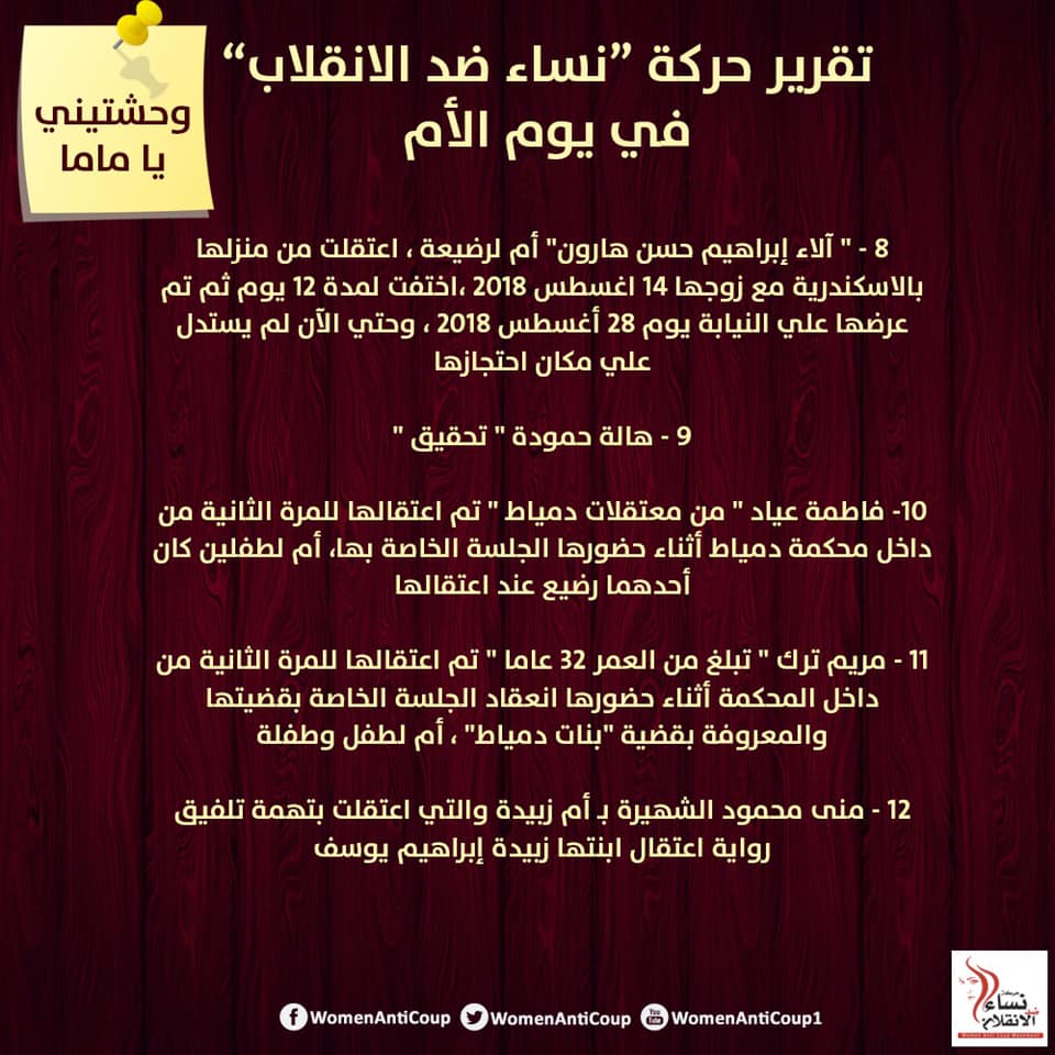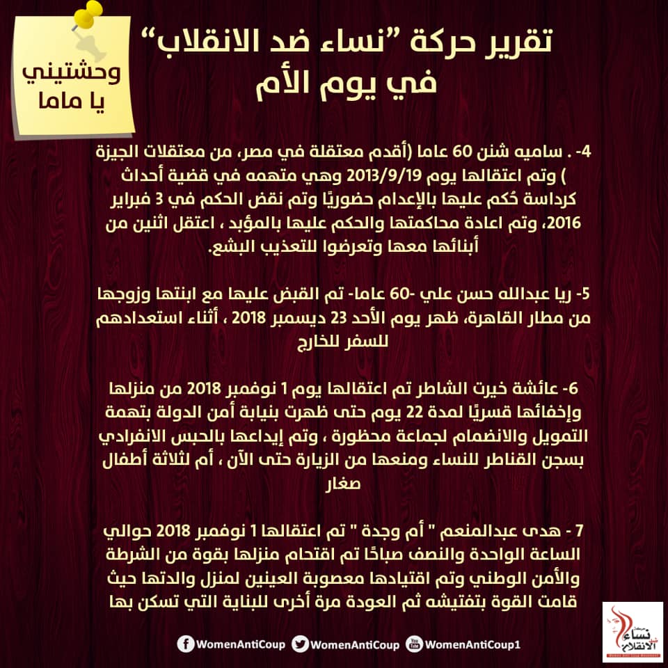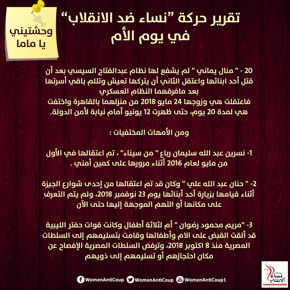 ولابد أن نلقي الضوء على أمهات وزوجات المعتقلين الذين يعانين أشد المعاناة في المحاكم و طوابير الزيارات أمام السجون والمعتقلات مع تعرضهن لأبشع الانتهاكات في ظل نظام قمعي مستبد ينتهك الحرمات وينكل بالنساء