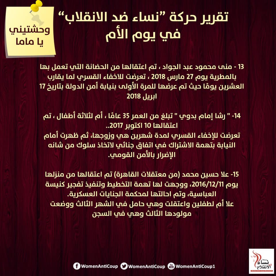 3- “مريم محمود رضوان ” أم لثلاثة أطفال وكانت قوات حفتر الليبية قد ألقت القبض على الام وأطفالها وقامت بتسليمهم إلى السلطات المصرية منذ 8 اكتوبر 2018، وترفض السلطات المصرية الإفصاح عن مكان احتجازهم أو تسليمهم إلى ذويهم