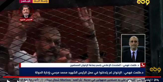 وقال فهمى خلال مداخلة هاتفية ببرنامج “من الآخر” مع الإعلامي إسلام عقل على تلفزيون “وطن”، مساء أمس: إن المهندس خيرت الشاطر برهن خلال شهادته للتاريخ وللعالم أجمع أن الإخوان المسلمين لم يكونوا يحكمون مصر بل إن البلاد كانت تدار من خلال الرئيس الشهيد محمد مرسي.