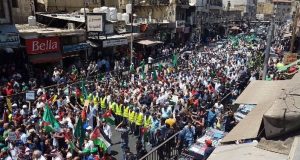 الآلاف يصلون صلاة الغائب على الرئيس الراحل محمد مرسي، خلال تظاهرة حاشدة ضد صفقة القرن في الأردن