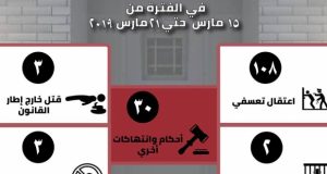 146 انتهاكًا لحقوق الإنسان فى مصر، هو مجموع ما وثَّقته التنسيقية المصرية للحقوق والحريات خلال الأسبوع المنقضي، فى الفترة من 15 مارس حتى 21 مارس 2019. وقالت المنظمة- عبر صفحتها على موقع التواصل الاجتماعي فيس بوك اليوم- إنها رصدت 146 انتهاكًا لحقوق الإنسان في مصر, تنوعت بين 108 حالات اعتقال تعسفي، وحالتي إخفاء قسري، و3 حالات من الإهمال الطبي بالسجون، ...