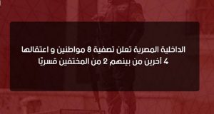 الداخلية المصرية تعلن تصفية 8 مواطنين واعتقالها ل4 آخرين من بينهم 2 من المختفين قسريًا.