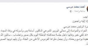 تتقدم أسرة الرئيس محمد مرسي بخالص العزاء والمواساة إلى معالي الوزير الشرعي الدكتور أسامة يس وأسرته في وفاة السيدة والدته، علماً أنه قد تلقى خبر وفاتها داخل جلسة محاكمته الباطلة اليوم بكل صبر واحتساب. سائلين الله تعالى أن يتغمد الفقيدة بواسع رحمته، وأن يجعل مثواها الفردوس الأعلى من الجنة، وأن يلهم ذويها الصبر والسلوان.