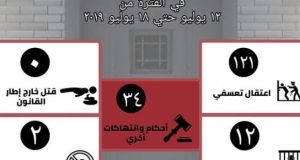 تواصل ميليشيات النظام الانقلابي تصعيد جرائمها التي ترتكبها بشكل ممنهج تجاه مناهضي الانقلاب العسكري داخل السجون وخارجها بعد تحول مصر لسجن كبير منذ انقلاب الثالث من يوليو 2013 على إرادة الشعب المصري واختطاف الرئيس الشهيد محمد مرسي. ورصدت “التنسيقية المصرية للحقوق والحريات” في حصادها الأسبوعي عن الفترة من يوم 12 يوليو حتى 18 يوليو 2019، 169 حالة انتهاك لحقوق الإنسان. وذكرت ...