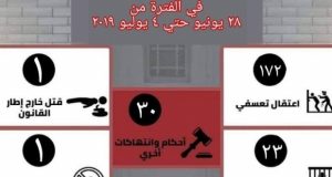 رصدت التنسيقية المصرية للحقوق والحريات، ارتكاب مليشيات الانقلاب 227 جريمة وانتهاكًا بحق المصريين خلال الأسبوع الماضي. وقالت المنظمة، في بيان لها عبر صفحتها على موقع “فيس بوك”، إنها وثّقت خلال الأسبوع الماضي، منذ يوم 28 يونيو حتى 4 يوليو 2019، 227 انتهاكًا لحقوق الإنسان في مصر، تنوعت بين 172 حالة اعتقال تعسفي، و23 حالة إخفاء قسري، وحالة واحدة بالقتل خارج ...