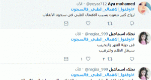 شهد هاشتاج “#أوقفوا_الإهمال_الطبي_فالسجون” تفاعلًا واسعًا عبر مواقع التواصل الاجتماعي؛ رفضًا للإهمال الطبي بحق المعتقلين في سجون الانقلاب، الأمر الذي تسبب في وفاة المئات، ووضع مئات آخرين على قوائم الموت البطيء. وكتبت آية محمد: “أرواح كتير بتموت بسبب الإهمال الطبي في سجون الانقلاب.. أصبحت السجون مقبرة للشرفاء بسبب الإهمال الطبي”. فيما كتبت “كتوتة كتوتة”: “في مصر لو ماموتش مقتول برصاصة هتموت ...