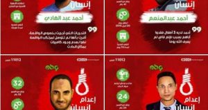كشف الناشط الحقوقي هيثم أبو خليل عن وجود 25 مصريًا بسجون الانقلاب العسكري، ينتظرون الإعدام في أي وقت، بعد استكمال كل الإجراءات القانونية المعيبة بقضاء الانقلاب. وتحت عنوان “٢٧ أعدموا و٢٥ ينتطرون الإعدام!! وهذا واجبك المتاح تجاه الباقين”، كتب أبوخليل: بنذكر حضراتكم إن اليوم بتنفيذ حكم الإعدام على أبرياء قضية كفر الشيخ الأربعة يصبح عدد من تم تنفيذ الحكم الإعدام ...