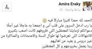 حصلت الطالبة «أميرة»، بنت الدكتور إبراهيم عراقي، أستاذ الجراحة والمسالك البولية بجامعة المنصورة والمعتقل بسجن وادي النطرون بتهم ملفقة، على المركز الأول «مكرر» في الثانوية العامة شعبة علوم، بمجموع 409.5 درجة. وقالت «أميرة» في تصريحات صحفية: “أهدي هذا التفوق لوالدي ولأسرتي ولكل طلاب الثانوية العامة المعتقلين، وللطالبة الشهيدة هالة أبو شعيع إحدى صديقاتي، رغم الظروف اللي كنا بنمر بيها ...